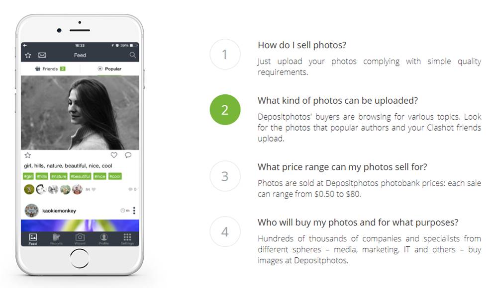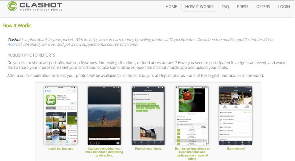 Clashot is a mobile app that allows you to make money with the photos that you have taken using your camera. You just need to upload your photos to the app then the app will upload it to the Depositphotos website.