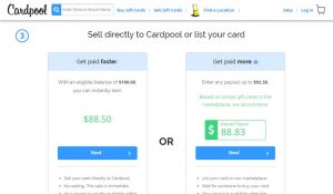 By using the marketplace option, you will get paid more but you will only be paid once someone buys your gift card. For a $100 gift card for Best Buy, Cardpool will pay you $88.50 for it if you choose to get paid faster.