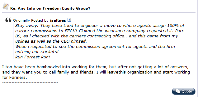 What made matters worse is that I found another forum that stated the same practices between Primerica and FEG. This means that when the leadership dropped Primerica and founded FEG, some of the shady tactics carried over. This is something that needs to be addressed.