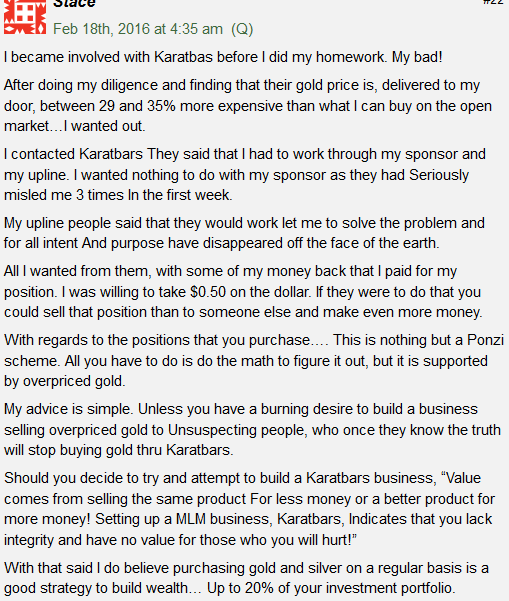 6. Here is a customer comment from a few month ago: “If I go back in time, I wouldn’t of never sign up for the package! Didn’t know that I couldn’t get a refund til months later when I look through some information that I found. No one wasn’t buying into this company, not even my mother. For months I went online and talked and share my referrals and I came back entry. I even listen to those conference calls while I was cleaning up for the man that introduced me to Karatbars to a neutral friend of ours. At this point, I am done with everythin that’s involved with Karatbars. Lucky I only bought the bronze package. I know that I can transfer to another person with a payment agreement but I don’t anyone who would want it. If you know anyone who would want my package, please let me know!!!”