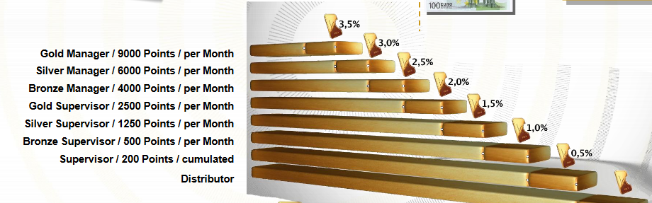Under Karatbars International Unilevel Bonus section: “As a Bronze Director you need at least 2 lines where one line generates 4,000 points (8,000 Euros turnover) and the other line(s) or rather the rest of your organization generate 2,000 points (4,000 Euros turnover).”
