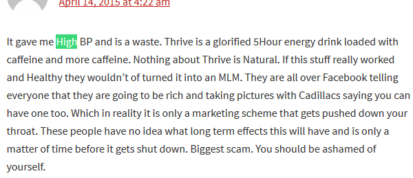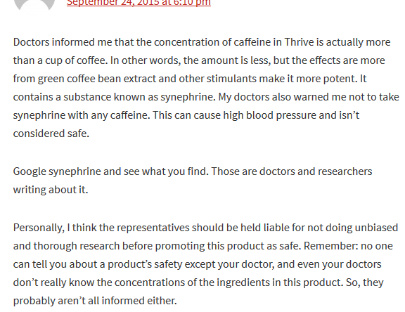 A relative of mine just began the Thrive routine. I asked them if it had caffeine, and they said no. I them told them the ingredients from the label on the Thrive website that have caffeine in them, and they said they would look for a “caffeine-free” version. I have a feeling they won’t find it. I feel bad for people who aren’t skeptical enough to check these things out, because companies like this will take advantage of them. If Thrive has true confidence in their product, they shouldn’t have a problem with educating their customers on what is in it.