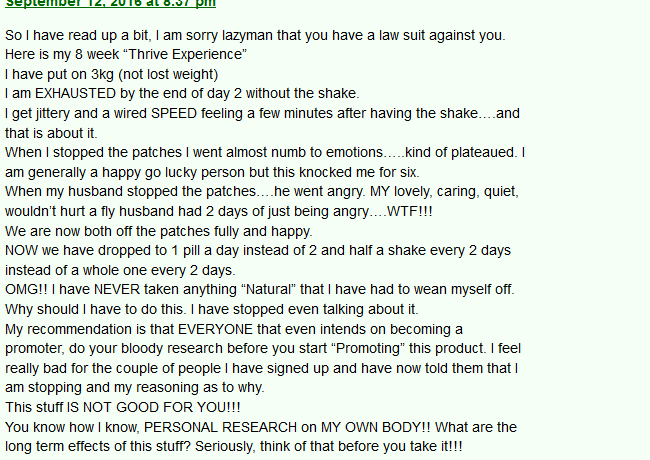 Just about every single comment I’ve read has been really negative. I have used this product since July, 2017 and have felt absolutely fine. I was told initially to start it slowly and gradually over the first few days. Both my husband and I have lost weight, it has provided energy, and we have maintained a healthy lifestyle without any issues. We are both in our 60’s. In addition, the FORM product has also helped my husband with his arthritis and prevented him from a second knee replacement (of course the weight loss is a major factor here too). I am a Promoter, but not in it at all for the money, and I have referred it on to others. Frankly, I feel terrific for taking the 3-step nutritional process and it has helped us both maintain good health. Thrive is a health and wellness SUPPLEMENT to enhance your own well being and lifestyle.