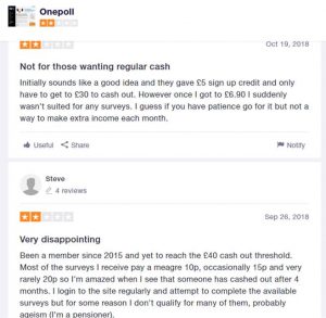 - The first thing that I didn’t like about OnePoll is that the site has a very high minimum cash out requirement. You will only be able to withdraw your money once it reaches £40. Unless you will be able to reach your referral limit quickly or be lucky enough to answer a lot of high paying surveys, then you cannot really expect to reach that amount quickly. It will typically take you 4 months or more before you are able to withdraw.