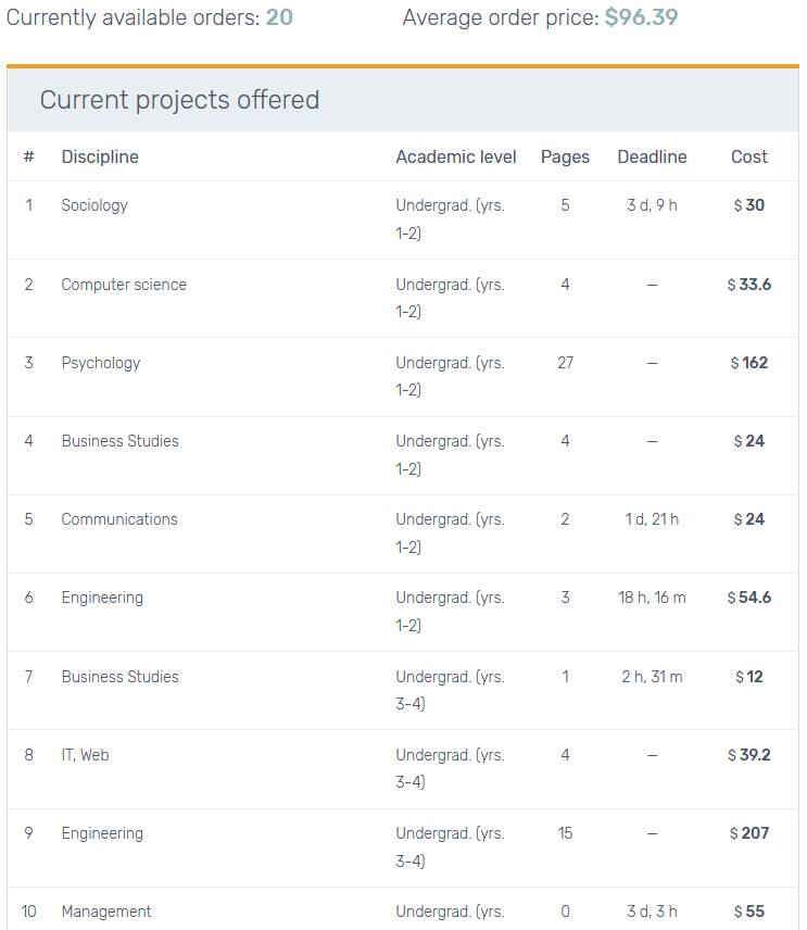 These assignments are categorized in their discipline, academic level, number of pages, deadline and cost as shown in this example below.